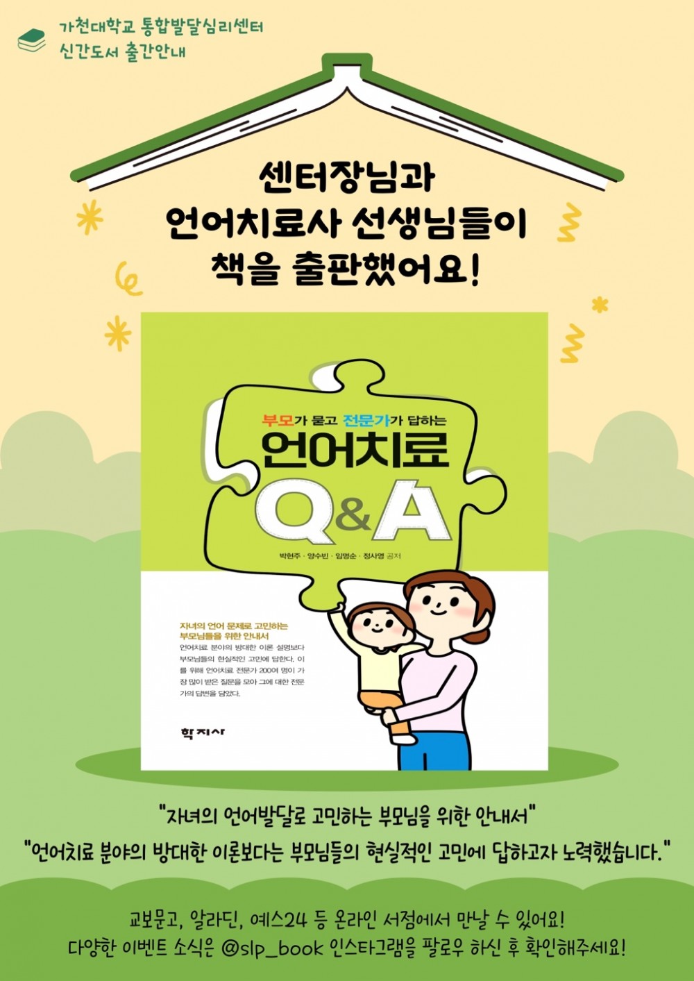 가천대학교 통합발달심리센터 신간도서 출간안내 등록일2025.11.24 조회수30 가천대학교 통합발달심리센터 센터장님과 연구와 치료에 함께 하시는 언어치료사 선생님들께서 함께 책을 출판하였습니다. 자녀의 언어문제로 고민하는 부모님들을 위한 현실적인 고민해결에 지침서가 되기를 바랍니다. 댓글 0댓글쓰기 댓글목록 등록된 댓글이 없습니다. 이전글 [공지] 가천대 통합발달심리센터 제3회 언어재활사 취업박람회 참여 다음글 [구인] 언어치료사 모집 목록