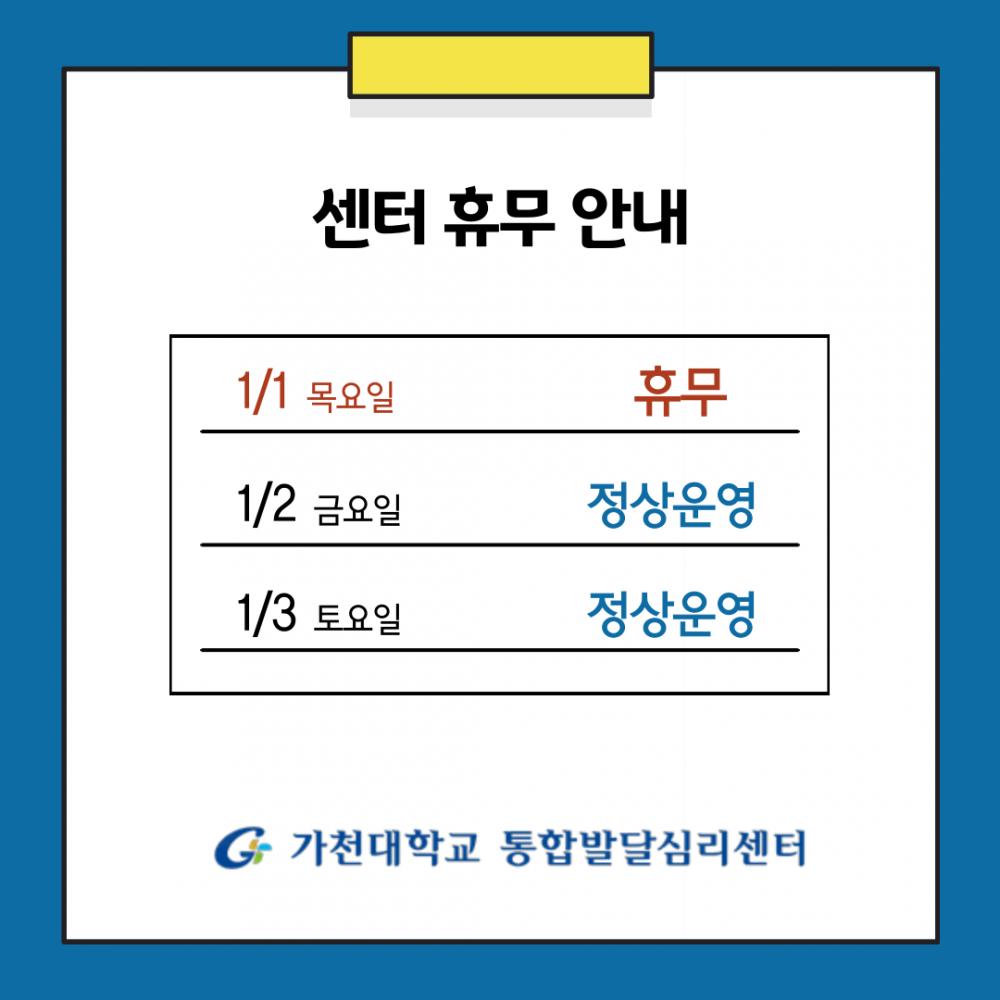 2026년 신정 센터 휴무 및 운영 안내 등록일2025.12.02 조회수45 댓글 0댓글쓰기 댓글목록 등록된 댓글이 없습니다. 이전글 이전 글이 없습니다. 다음글 한국발달재활사협회 역량강화 보수교육 안내 목록